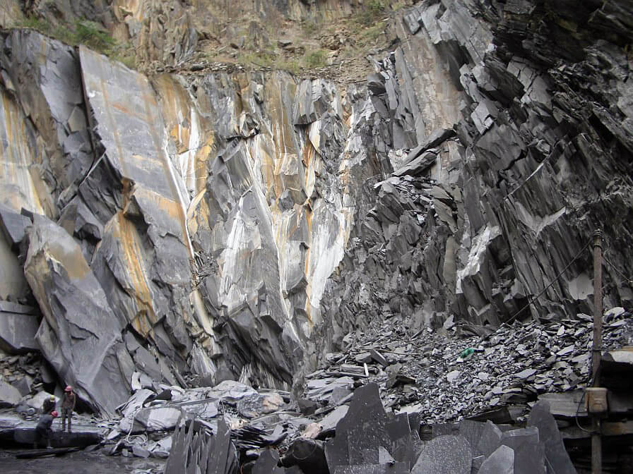 Серый кровельный сланец и его черный (аспидный) собрат обычно залегают ровными пластинами. Геометрические параметры кровельного сланца порой поразительно точны. Разрезанный на плиты, он используется для изготовления биллиардных столов!