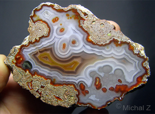 Среди агатов встречаются камни, слоистость которых носит чрезвычайно любопытный характер. Однако чаще всего рассмотреть затейливые изгибы наслоений затруднительно: невыразительная окраска не дает насладиться фантазийным рисунком.