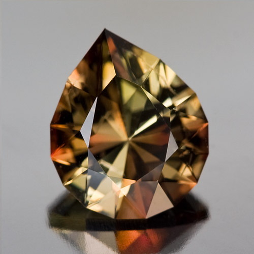 - Цвет – широкая цветовая гамма, в основном теплых тонов: серый, желтый, красный, коричневый, оранжевый, золотистый, бурый, розовый. Встречаются также бесцветные и темно-зеленые образцы. Особенность минерала в том, что у него ярко выраженный плеохроизм – то есть цвет может меняться в зависимости от угла освещения.