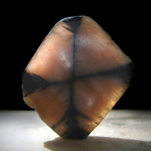 - Хиастолит – непрозрачный минерал, кристаллическая структура которого агрегатирована с угольными или глинистыми веществами. В результате этого, в поперечном разрезе наблюдается четкое деление на четыре сектора, разделенных черным или темным крестом. В продольном разрезе четко видны параллельные всей длине кристалла темные полосы.