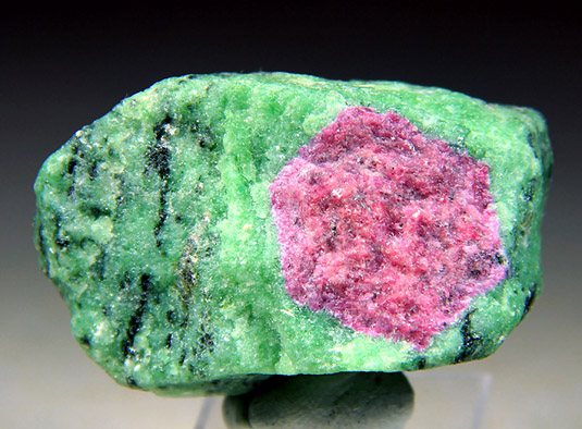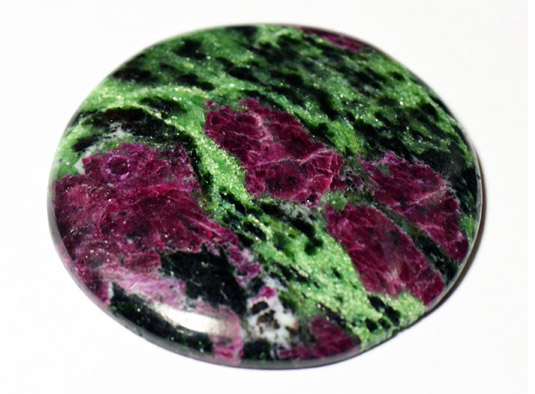 Черная рябь по зеленому полю сама по себе весьма декоративна, но природа сочла такую расцветку скучной и оживила цоизит врастаниями малиновых