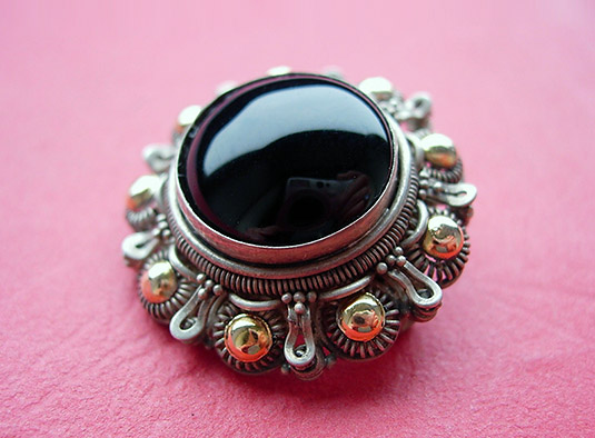 Ювелирные украшения с гагатовыми вставками, окруженными россыпями бриллиантов и блеском серебряной скани, встречаются редко. Пик моды на ювелирный гагат пришелся на викторианскую эпоху, когда роскошь облекалась в одежды сдержанности, а любимым предписывалось быть черному цвету.