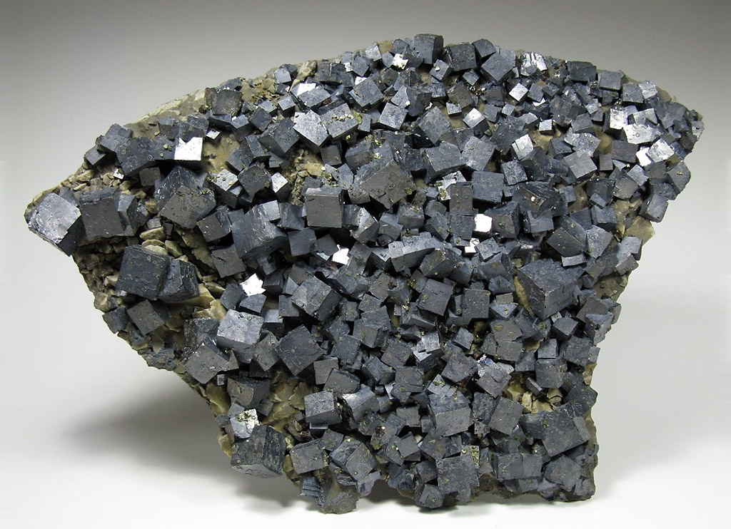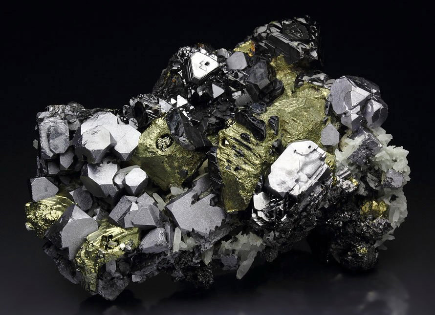 Красивые образования кристаллов галенита вместе с халькопиритом и сфалеритом.