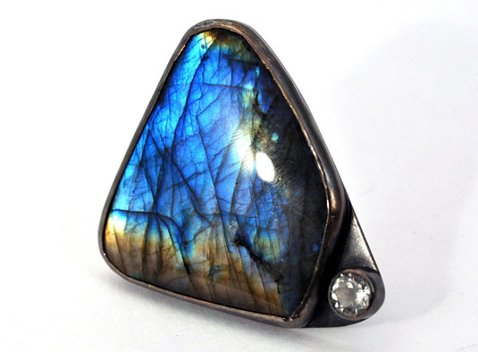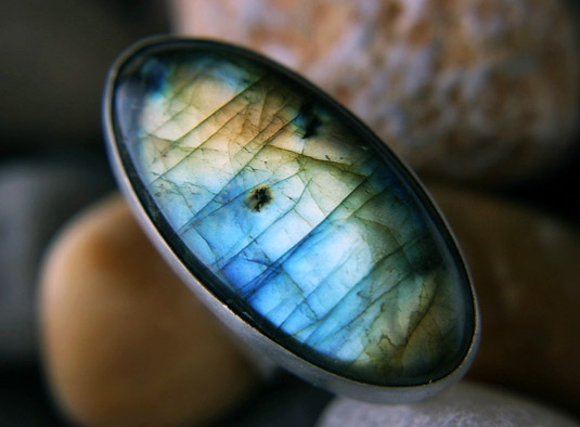 Оправленный в металл, лабрадорит в большей степени защищен от повреждений. К тому же для изготовления ювелирных вставок используются камни, в толще которых нет значительных структурных нарушений. Поэтому небольшие кабошоны из лабрадорита не боятся самых сложных условий ношения.