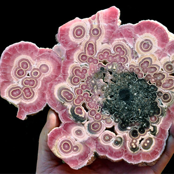 Тем не менее, расслоенный на затейливо извитые полосы, натуральный родохрозит способен соперничать красотой с малахитом и