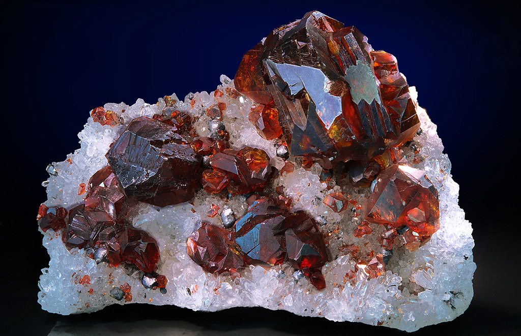 Великолепные кристаллы сфалерита из Китая. В качестве матрицы выступает красивый кристаллизованный кварц в ассоциации с немногочисленными кристаллами галенита. Фотография взята с сайта - www.saphiraminerals.com