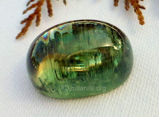 Примеси в массиве султанитового кристалла иногда образуют тонкие игольчатые включения. Такие камни гранят кабошоном: эффект