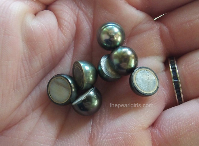 Во-вторых, часты попытки использования жемчужин, приросших к перламутровому покрытию раковины. Срезанная, такая жемчужина имеет полусферическую форму – а то и напоминает слегка округленный диск. Склеивание половинок позволяет имитировать полноценный жемчуг – особенно если металлическая оправа маскирует линию соединения.