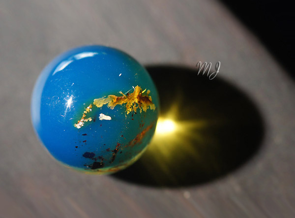 Совершенно непрозрачный с виду шарик из доминиканского янтаря отлично пропускает и фокусирует свет! Если бы этот шарик был полностью прозрачен, то им можно было бы воспламенить спичку.