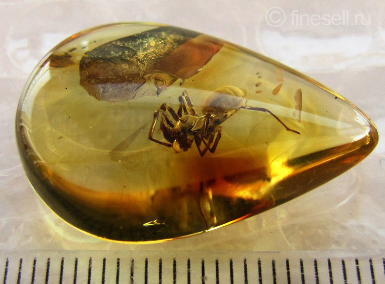 Инклюз паука. Вес янтаря – 2,5 грамма. Величина паука – 7 мм. Этот образец был продан с аукциона eBay за 350 долларов. Продавец недобрал 100% цены: чуть больше настойчивости, и паучка в янтаре можно было продать в два раза дороже.