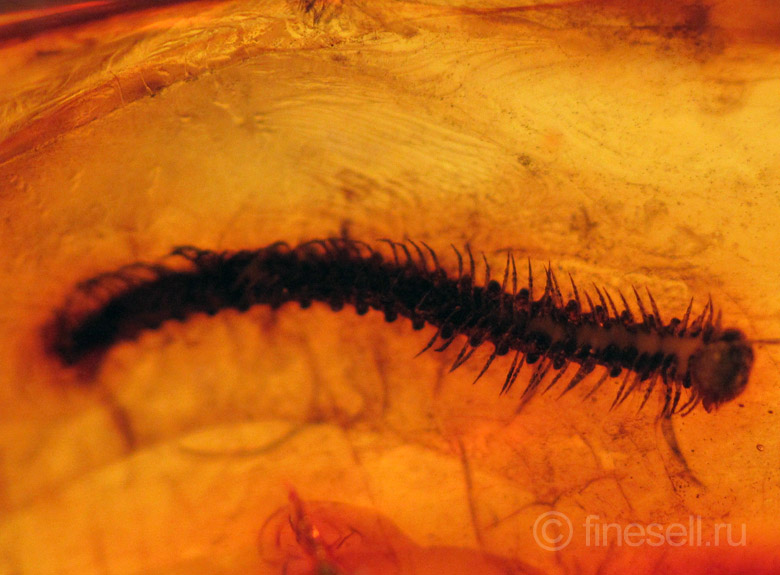 Многоножка, увязшая в смоляном натеке несколько десятков миллионов лет назад. Длина насекомого 6,5 миллиметров. Вес инклюза 1,75 грамма. Цена – 700 USD!