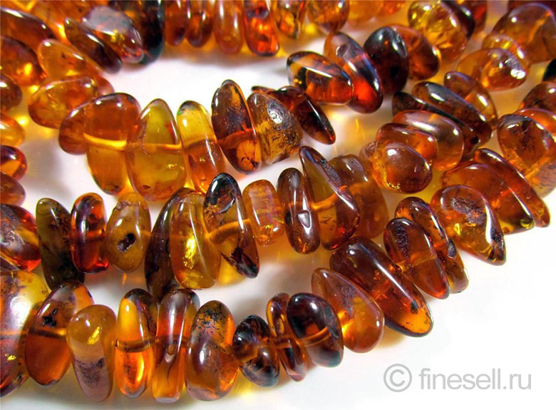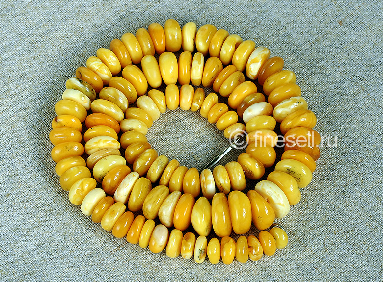 Бусы из мелкой галтовки весом в 60 граммов стоят 60 долларов. Их невысокая цена обусловлена тем, что бусинки изготавливаются из ассиметричных кусочков янтаря, будучи просто отполированными. Потери в массе при обточке минимальны.
