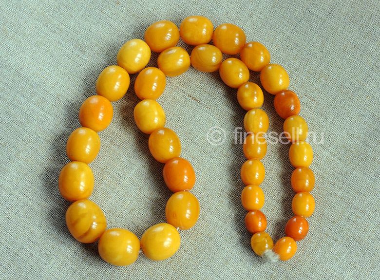 Бусы из пейзажного желтого янтаря, который успел немного состариться и стал ярче. Весят они 50 граммов, стоят заслуженные 350 долларов. Цены актуальны на сегодняшний день, однако раньше такие бусы продавались в разы дешевле.