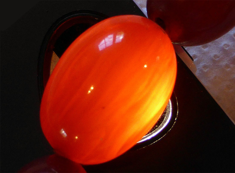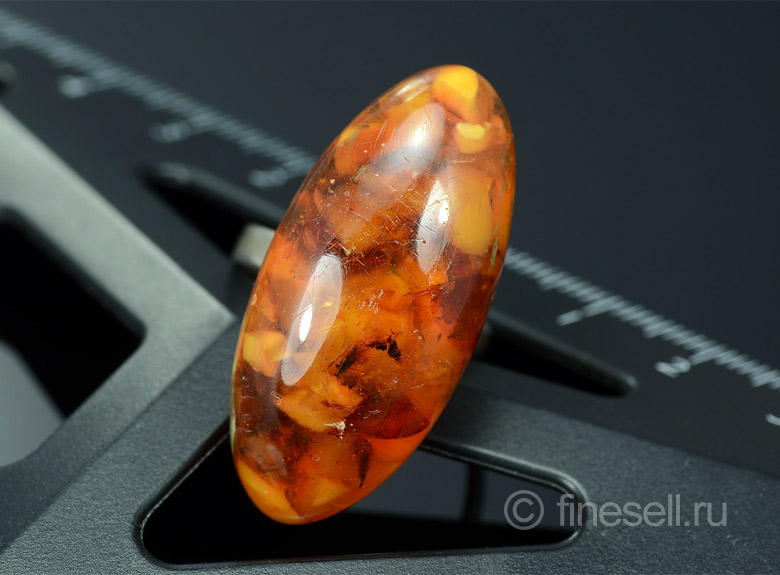 Кабошон из ресолана. Сходство с янтарем умеренное, однако по ряду эстетических параметров ресолан превосходит бакелит.