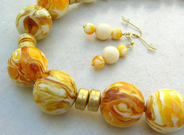 Бусы из галалита. Бусинки из этого материала отличаются своеобразием рисунка. Структура материала вызывает всегда правильное ощущение того, что перед вами пластик, но никак не янтарь.