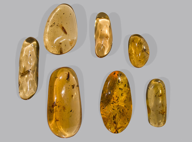 На фото изображены Мадагаскарские копалы. Некоторые из этих кабошонов представляют собой инклюзы, что вообще-то не редкость для африканского копала.