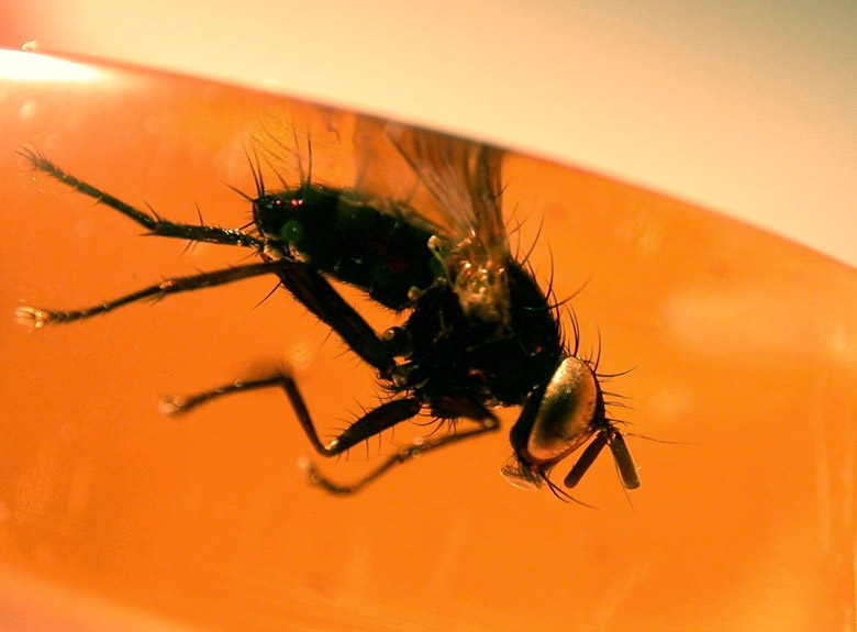 Инклюз мухи в копале, возраст которого не превышает 250-ти лет. Насекомое сохранилось идеально. Цвет мухи не изменился, а сама тушка выгладит так, как будто попала в смолу совсем недавно.