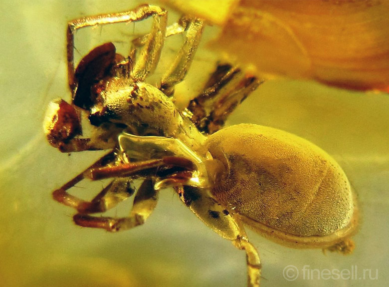 Инклюз паука в натуральном балтийском янтаре. Отлично видна полупрозрачная полость на месте усохшего брюшка паука. Очевидно: паук не вчера запечатан!