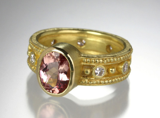 Золотое 18-ти каратное золото. Империал топаз – 1.84 карата и 8 бриллиантов общим весом 0.34 карата. Стоит это замечательное кольцо всего ничего - $5,730.00. Автор дизайна украшения - Barbara Heinrich. Источник фотографии – quadrumgallery.com.