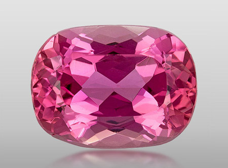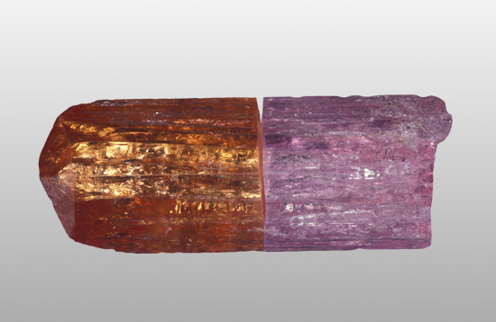 Этот кристалл империал топаза был распилен пополам. Образец, что справа бы подвергнут термообработке. В результате получен чистый розовый цвет камня. Оба цвета очень востребованы на рынке. Источник фотографии – GIA education.
