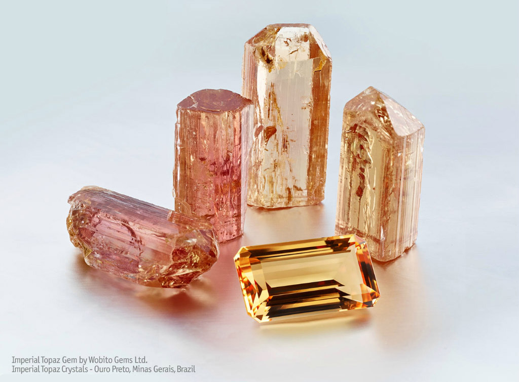 Кристаллы натурального империал топаза из месторождения Минас Жерайс, Ору Прету, Бразилия. Цвет этих топазов полностью натурален. Термообработка не применялась. Фото используется с разрешения championphoto.com и wobito.com.